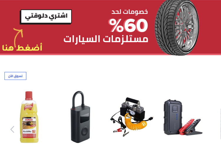 عروض هائلة من نون على مستلزمات السيارات والخصومات تصل إلى 60% في بعض الأحيان وتشمل، زيوت السيارات وأجهزة قياس الهواء الخاص بإطارات السيارات وأجهزة تزويد الهواء المحمولة لإطارات السيارات، وأسلاك توصيل التيارالكهربائي بين بطاريتين وغيرها من مستلزمات السيارات المختلفة.